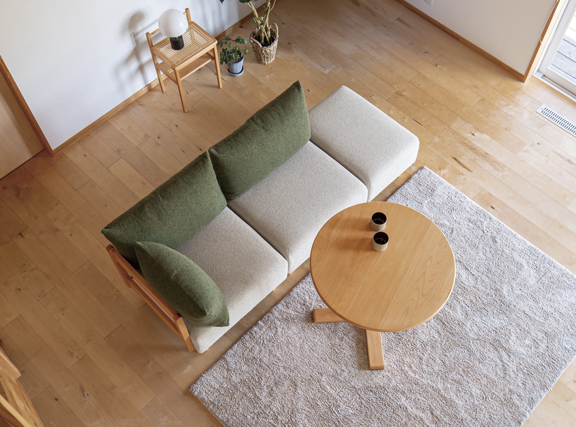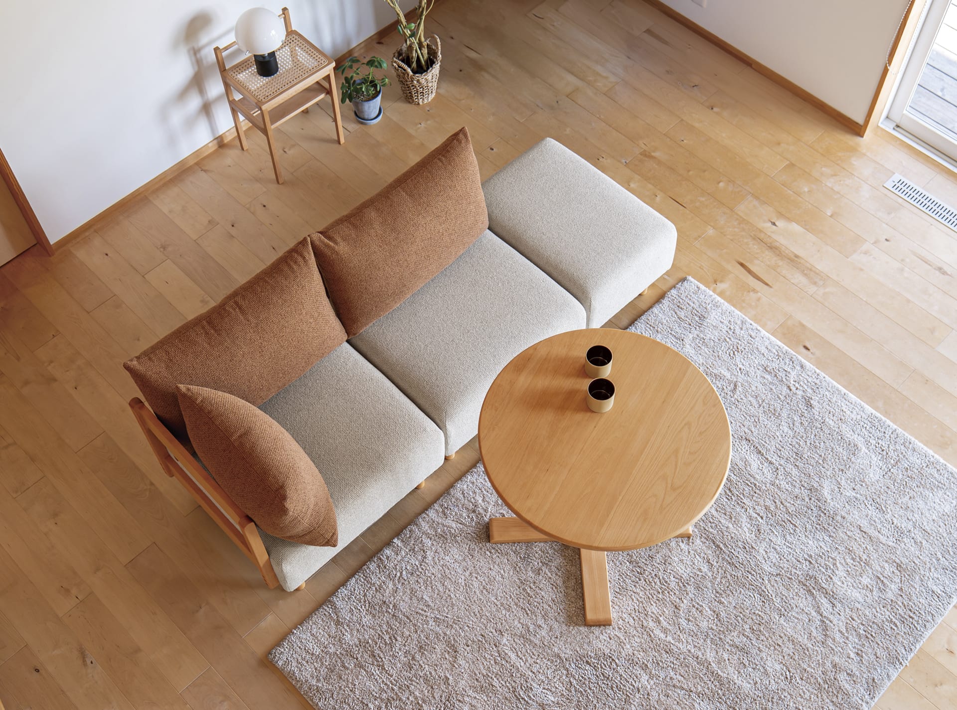 ラタンの天板の下には収納スペースになる棚を設けています。