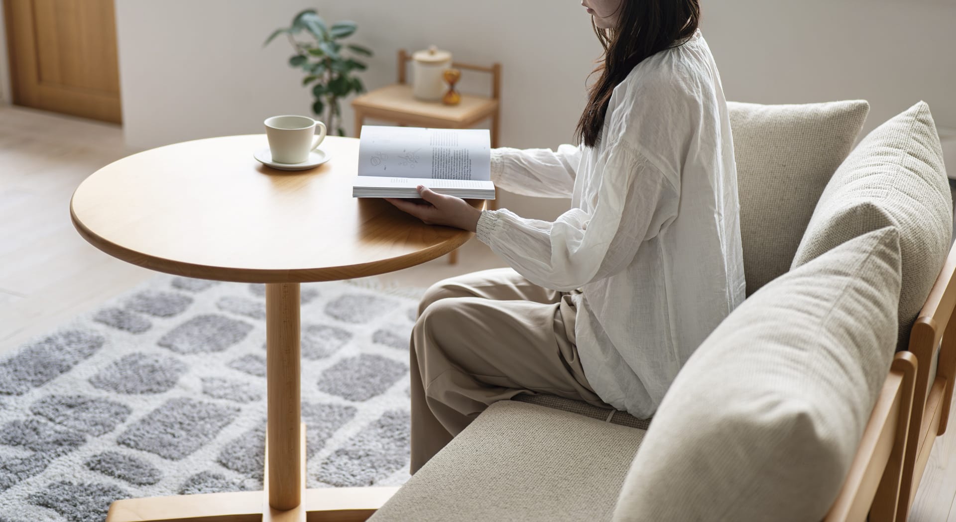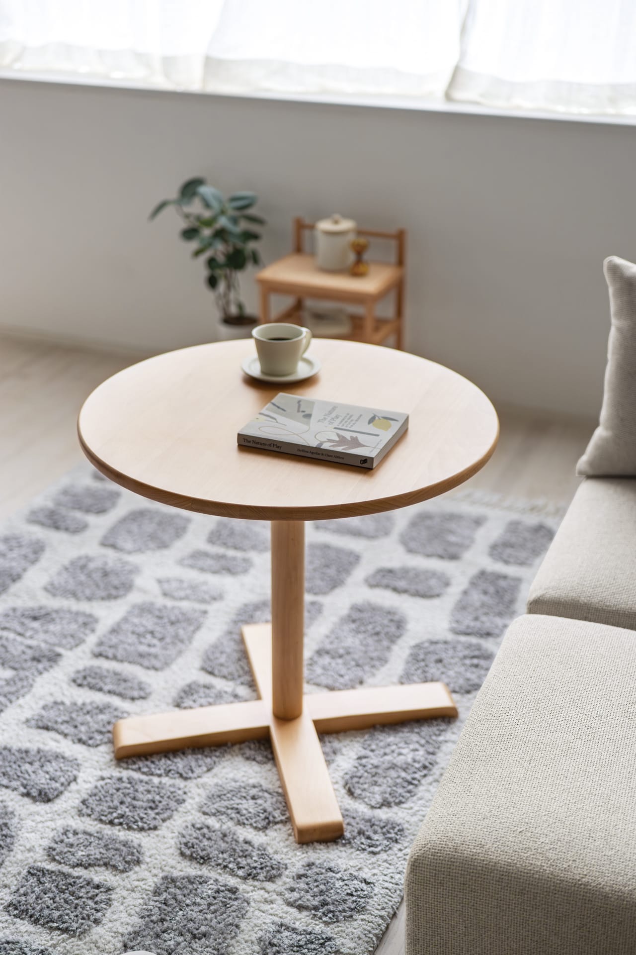 ラウンド型の天板はソファ前でも圧迫感がなく、コンパクトな空間で使いやすいテーブルです。